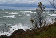 A very blustery day with winds off Lake Huron where waves are battering the shoreline and, in some cases, over the shore trail.