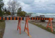 A very blustery day with winds off Lake Huron where waves are battering the shoreline and, in some cases, over the shore trail.
