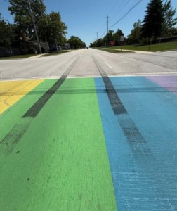 On June 28, 2025 the PRIDE Rainbow crosswalk, located on Gustavus Street adjacent to Saugeen District Senior School, was damaged when a driver intentionally spun the tires of their vehicle, leaving “burn-out” marks on the crosswalk.