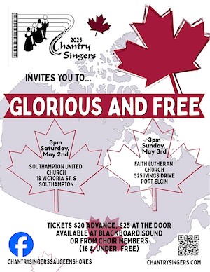 May 3: Chantry Singers presents in Concert ‘Glorious and Free’ – All Canadian Music 3:00 p.m. – Faith Lutheran Church Port Elgin Tickets: See poster for details