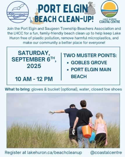 Septemer 6: Port Elgin & Gobles Grove Beaches - family friendly clean-up Required: gloves and closed-toe shoes 10:00 a.m. - noon See poster for sign-up details
