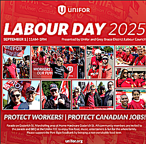 September 1: Grey Bruce Labour Council hosts annual Labour Day Parade and events Goderich St., Port Elgin (Saugeen Shores) Lunch at Unifor Family Education Centre (former CAW) 11:00 a.m.