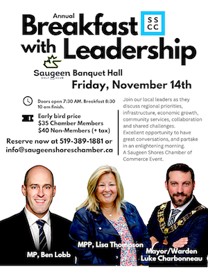 November 14: Breakfast with the Leaders Saugeen Golf Club - Banquet Room Doors open 7:30 am. Breakfast at 8:30 am Event concludes at 10 am. Chamber members: $39.55 (incl. tax) […]