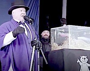Mayor Kirkland, having studied to become fluent in ‘groudhogeze’, listened carefully as Wiarton Willie gave him the news.  After discussion with his shadow cabinet, the Mayor announced to the waiting crowd that Willie had not seen his shadow and, therefore, … “it’s going to be an early Spring!”