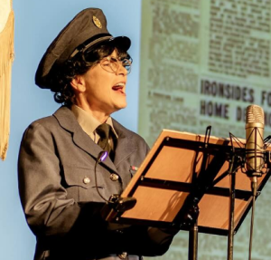 Portraying her aunt dressed in uniform as an RCAF clerk, Vllance captures the period of 1938 to 1945 by singing the popular love songs of WW2, while photos of local veterans and historical scenes of Saugeen Shores, supplied by war-researcher Bill Streeter, are projected on a large screen in the background.