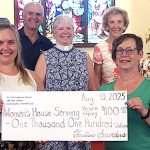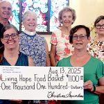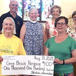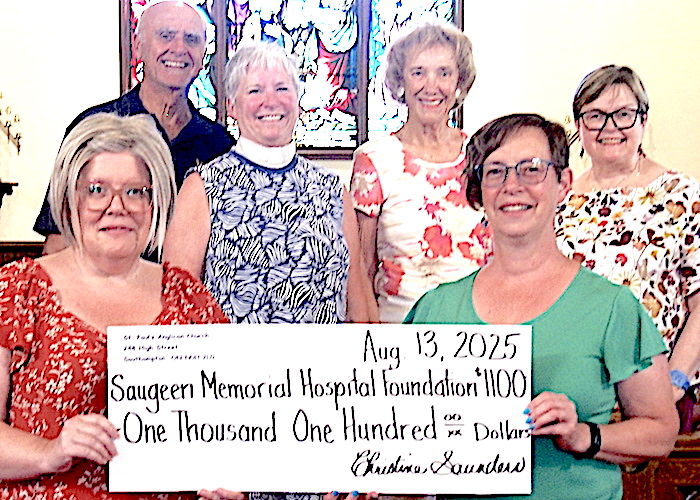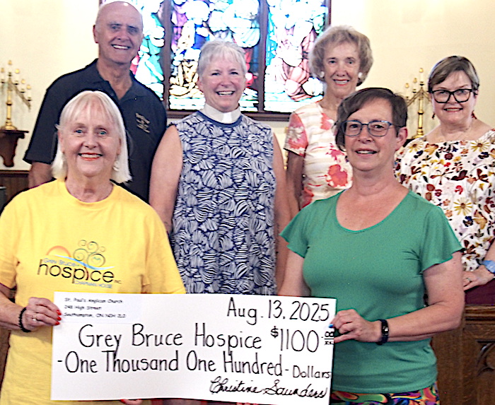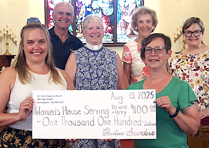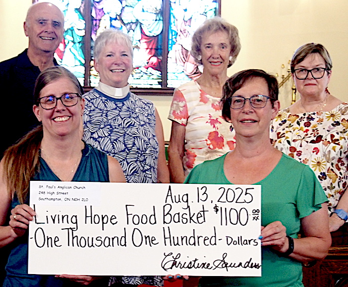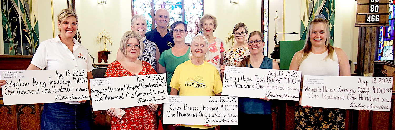(L-R back row) Rev. Ann Veyvara-Divinski, Church Warden Doug Goar, Christine Saunders, Maureen Simpson and Martha Bowden; (L-R front row) Karin Friis (Port Elgin Food Bank), Tracy Murray (Saugeen Memorial Hospital Foundation), Brenda Vanderploeg (Grey-Bruce Hospice), Trish Verburg (Living Hope Food Basket) & Danielle Bois (Women’s House serving Bruce & Grey)